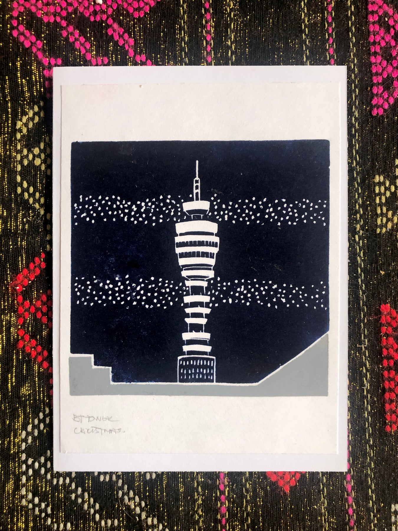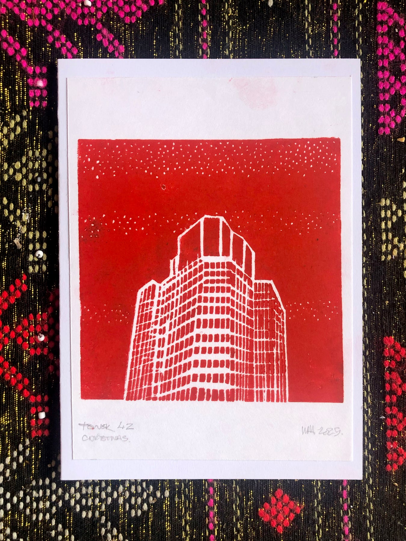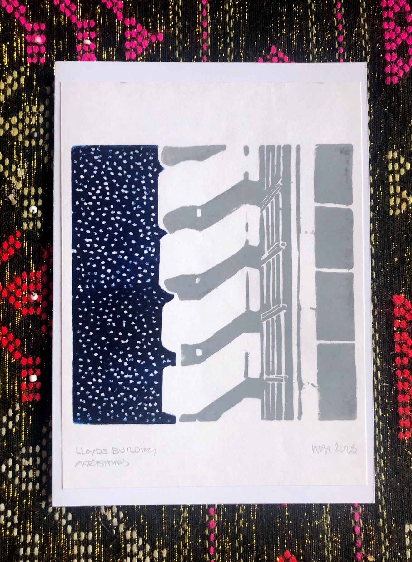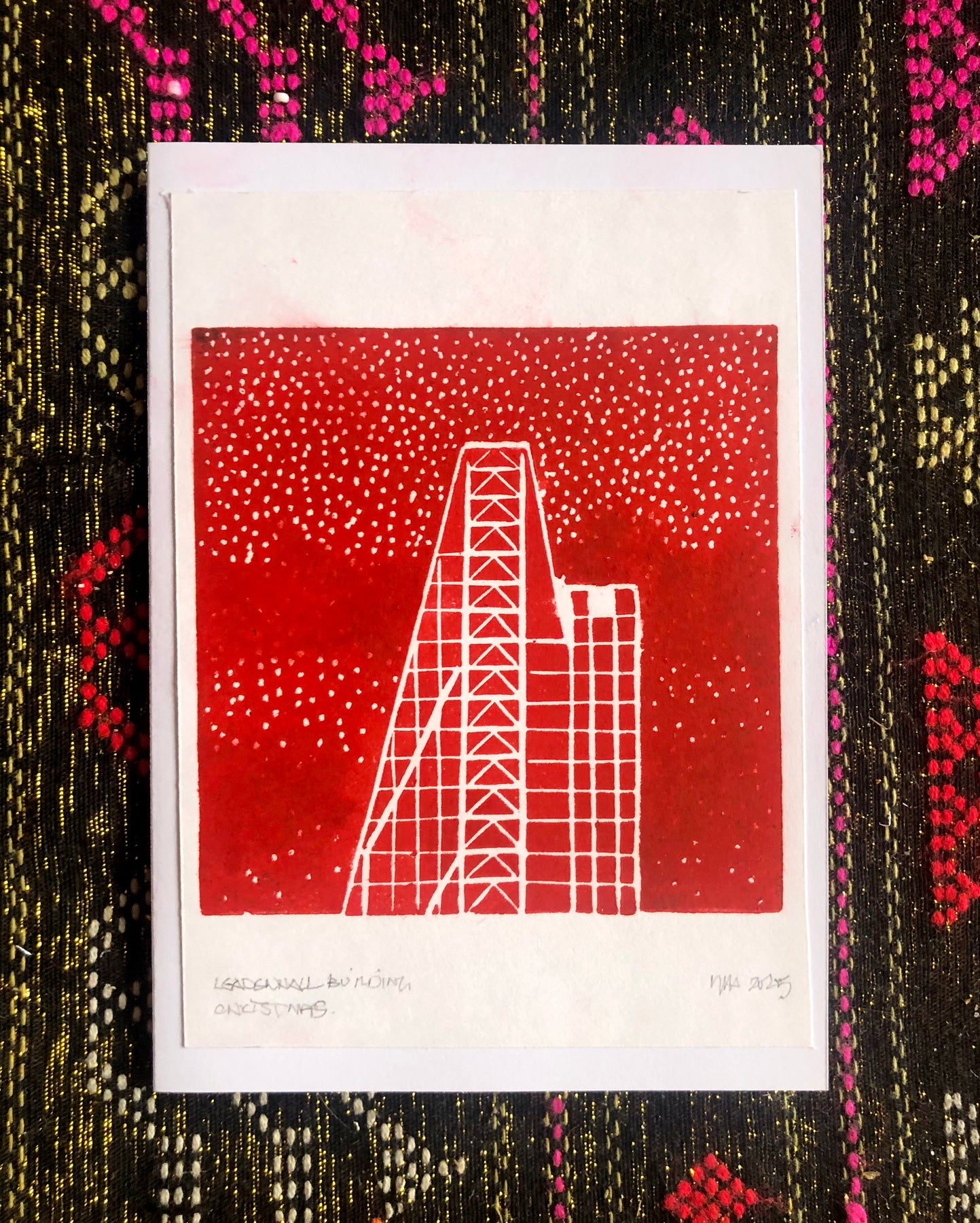 Hand-printed linocut Christmas cards of some of London's most iconic architecture from artist and printmaker Bill Hunt are now available to buy from Open City.